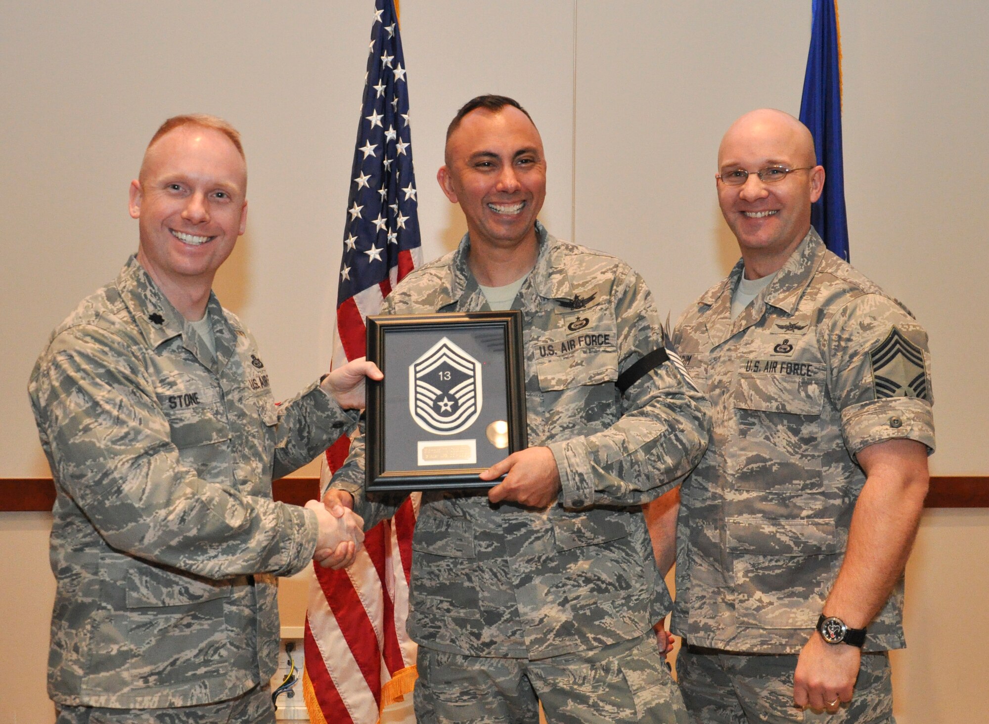 Master Sgt. Jill LaVoie, 460th Space Wing Public Affairs superintendent, gets her newest stripes “tacked on” by Col. Dan Dant, 460th SW commander, and Chief Master Sgt. William Ward, 460th SW command chief, during a promotion release party Feb. 28, 2013, at the Leadership Development Center on Buckley Air Force Base, Colo. LaVoie is one of six Team Buckley senior master sergeants selects. (U.S Air Force photo by Staff Sgt. Nicholas Rau/Released)